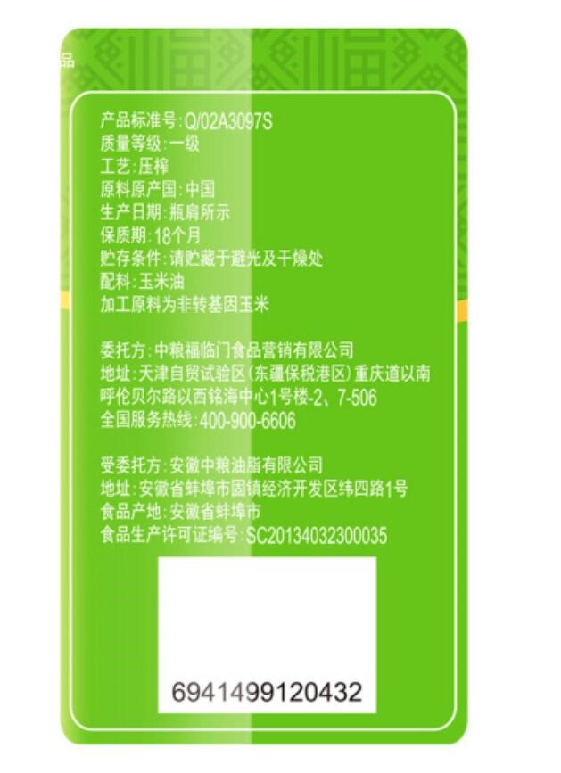 • 商品名称:福临门 食用油 非转基因压榨玉米油(京东定制)6.18L 中粮出品