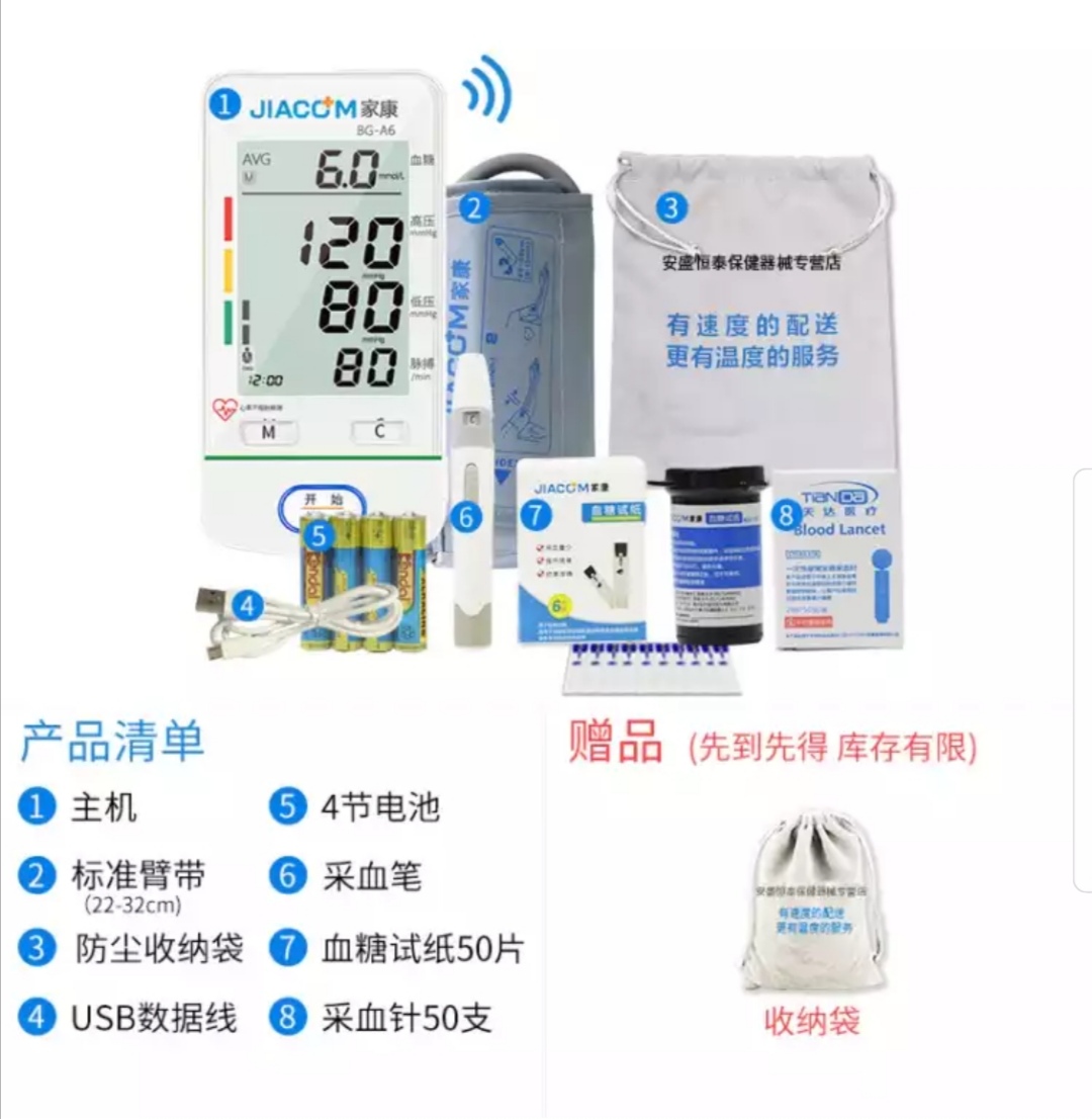 • 商品名称:家康 血压血糖一体机 血压仪 语音播报 血压血糖测量仪家用 血压计 医用 上臂式测量血压血糖仪器 血压表+臂带+电源线+50片血糖试纸条+采血针,货源有限,按预定顺序发货。