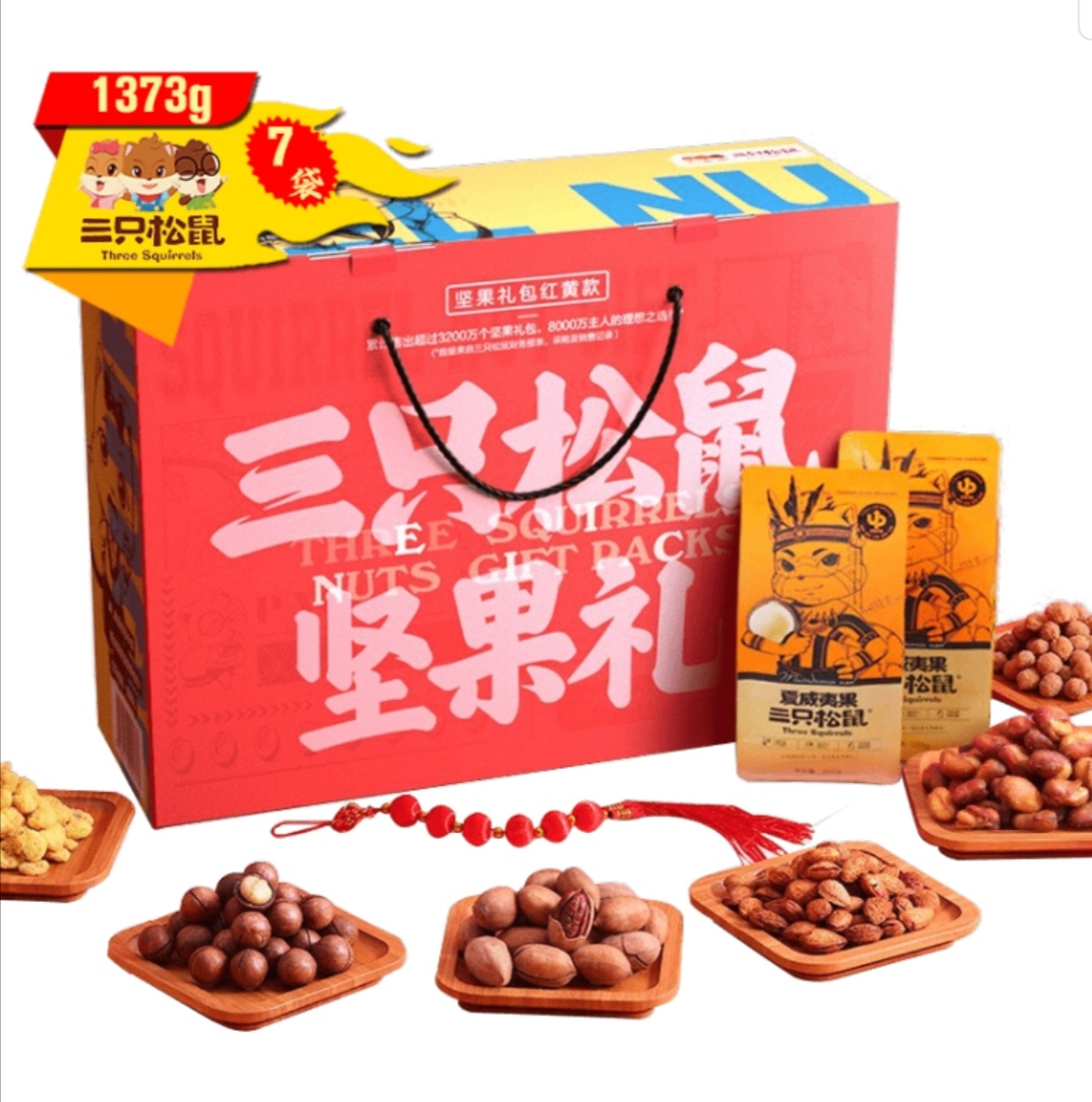 • 商品名称:三只松鼠 坚果礼盒 休闲零食干果大礼包红黄款 每日坚果混合组合 春节年货礼盒 坚果礼1373g(7袋)