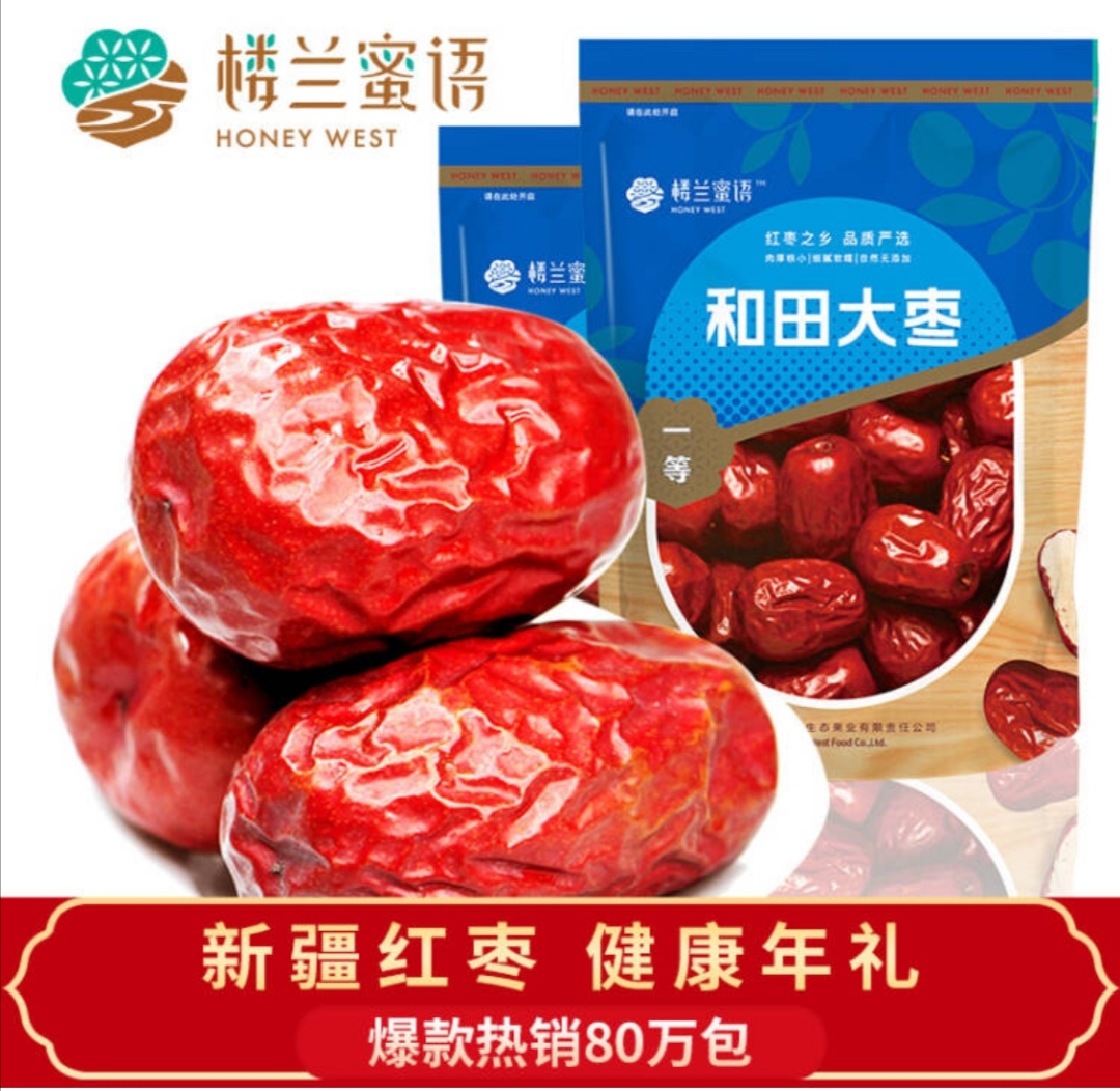 • 商品名称:楼兰蜜语 蜜饯果干 新疆特产 一等五星和田红枣500g*2袋 和田大枣可夹核桃 量贩装零食