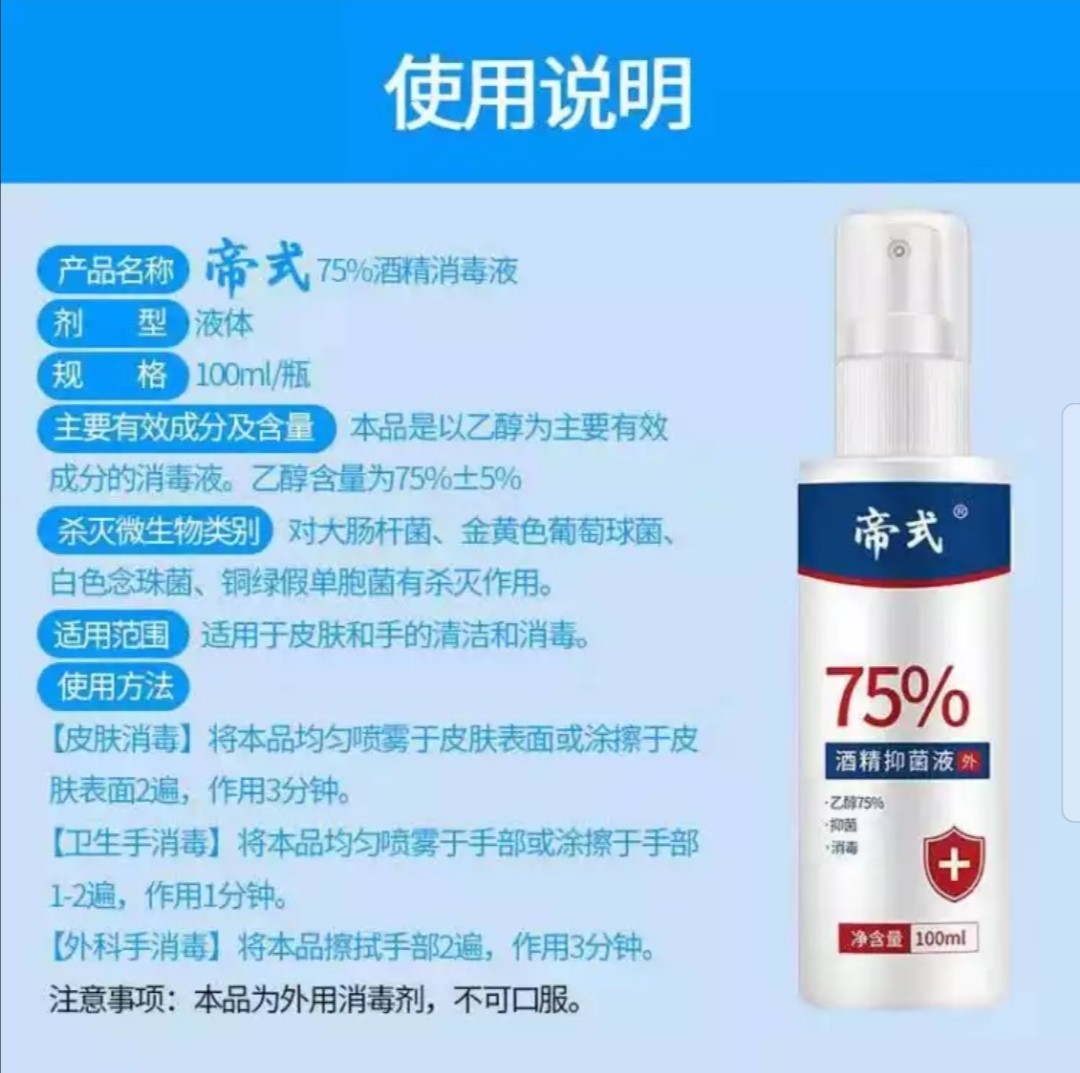 • 商品名称:75%医用酒精消毒液2瓶家用清洁杀菌伤口皮肤物品消毒喷雾 75%强效100ml*2瓶