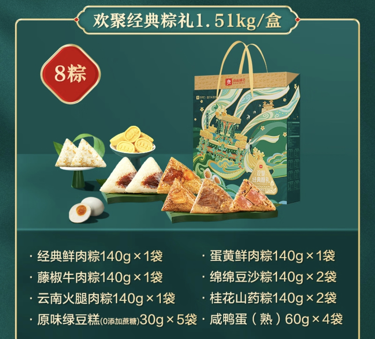 蛋黄鲜肉粽140克*1/袋 经典鲜肉粽140克*1/袋 云南火腿肉粽140克*1/袋 藤椒牛肉粽140克*1/袋 桂花山药粽140克*1/袋*2 绵绵豆沙粽140克*1/袋*2 原味绿豆糕(O添加蔗糖)30克*1/袋*5 咸鸭蛋(熟)60克*1/袋*4